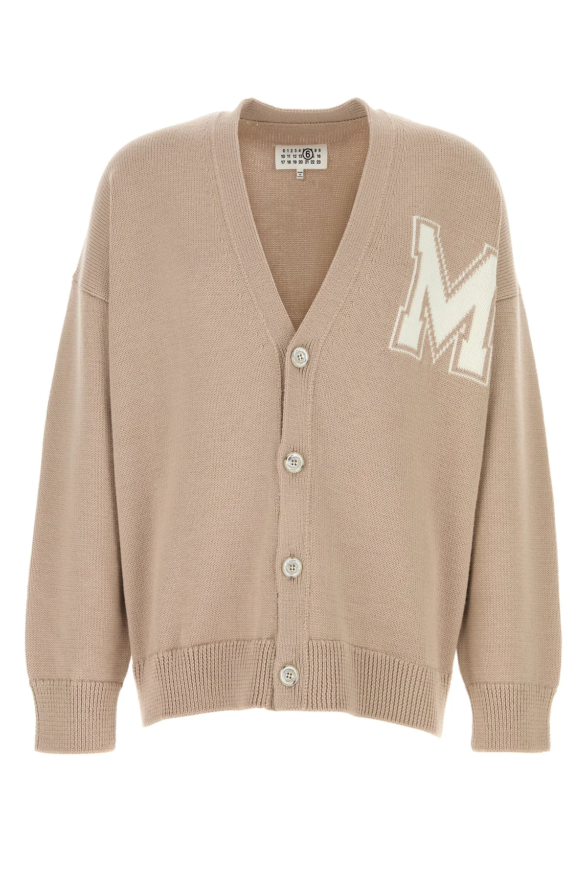 Cardigan realized in virgin wool and acrylic with poplin insert on the hemline characterized by logoed embroidery on the chest and iconic contrasting stitching at the back. - V neckline - Buttons closure - Ribbed cuffs and hemline DETAILS Beige wool and acrylic cardigan Exterior: 50% Virgin wool 50% Acrylic Made in romania Sample size: M