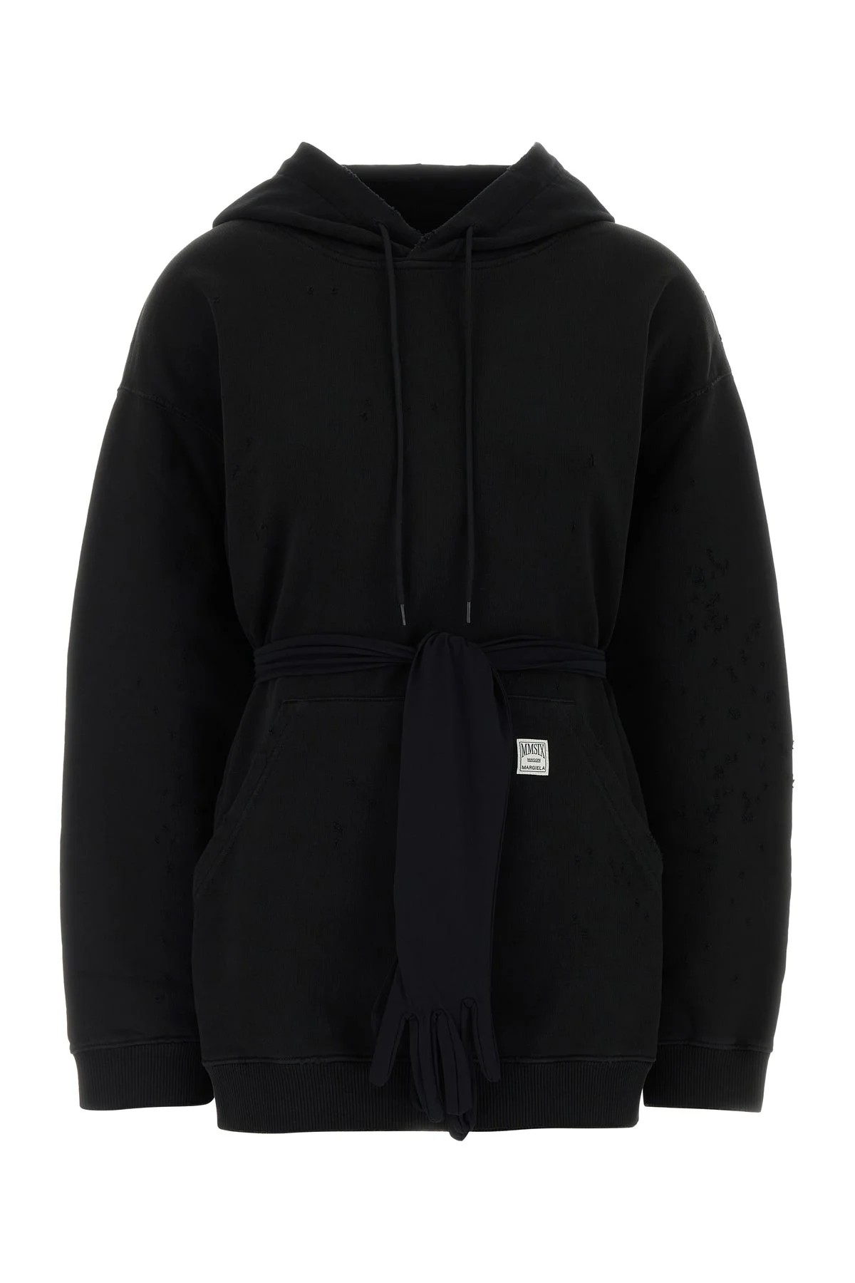 Mini sweatshirt dress realized in distressed effect cotton characterized by iconic contrasting stitching at the back enriched by logoed label at the front. - Drawstring hood - Laces to tie at the waist - Pouch pocket - Ribbed cuffs and hemline - Unlined DETAILS Black cotton mini sweatshirt dress Exterior: 100% Cotton Made in portugal Sample size: S
