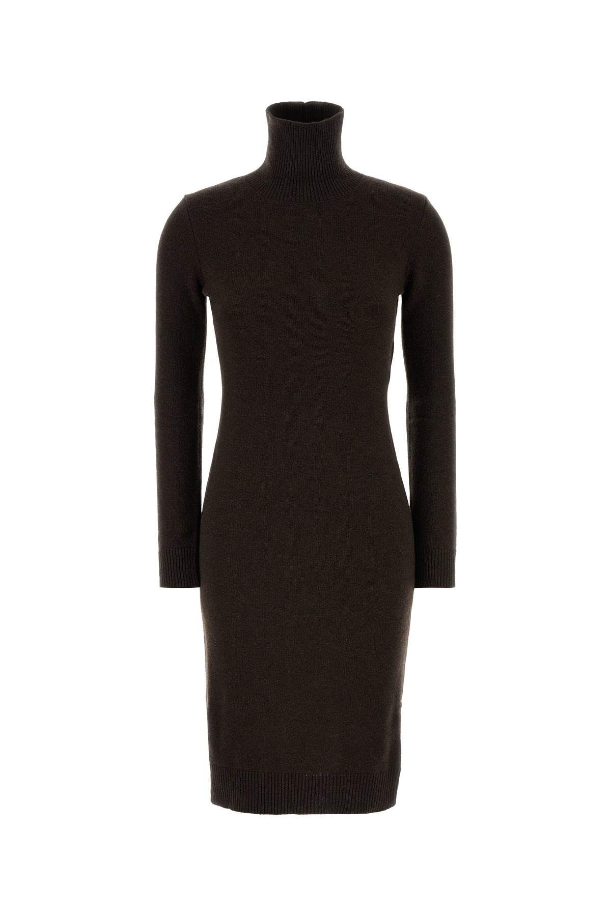 Sweater dress realized in wool blend enriched by logoed label at the back. - High collar - Ribbed cuffs and hemline - Unlined DETAILS Dark brown wool blend sweater dress Exterior: 80% Wool 20% Nylon Made in italy Sample size: XS