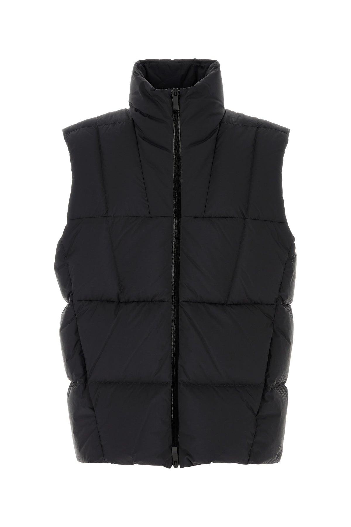Sleeveless down jacket realized in quilted nylon enriched by rubberized logoed patch at the back. - High collar - Zip closure - Two zip pockets at the front - Drawstring on the hemline - Lined DETAILS Black nylon down jacket Exterior: 100% Nylon Lining: 100% Nylon Padding: 90% Down 10% Feather Made in romania Sample size: 3