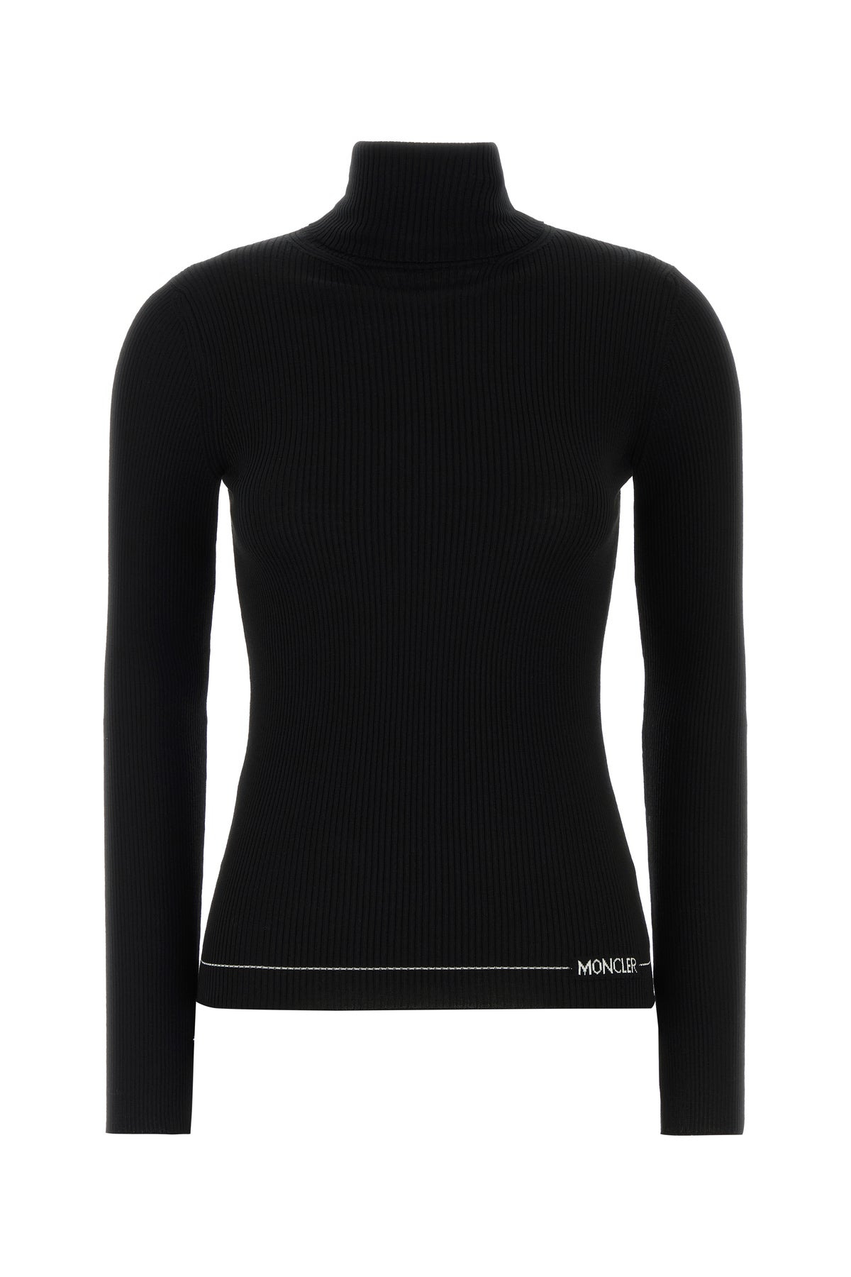 Long-sleeves t-shirt realized in pure virgin wool characterized by contrasting embroidered logo on the hemline. - Turtleneck DETAILS Black wool t-shirt Exterior: 100% Virgin wool Made in romania Sample size: S