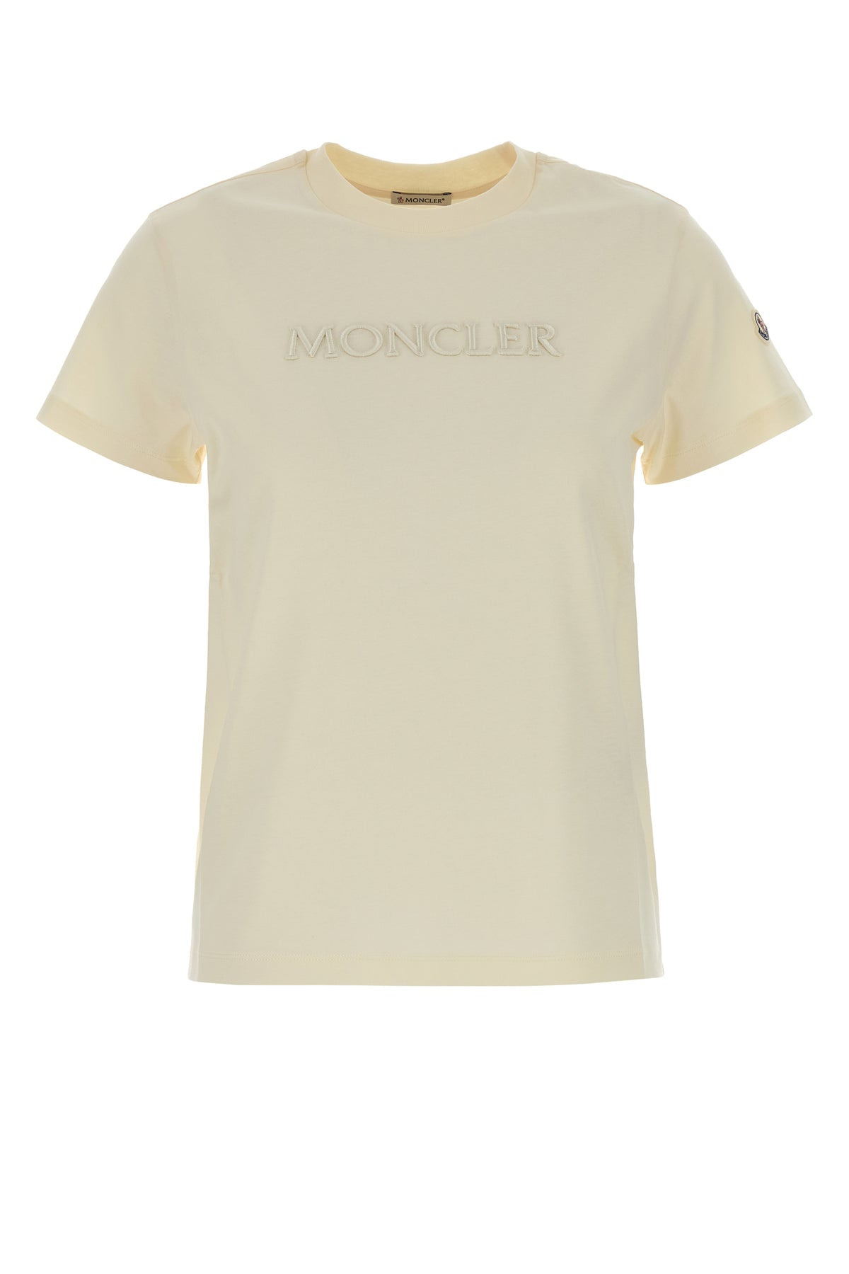 T-shirt realized in pure cotton characterized by tonal embroidered logo on the chest enriched by logoed patch on the sleeve. - Ribbed crew-neck DETAILS Crema cotton t-shirt Exterior: 100% Cotton Made in turkiye Sample size: XS