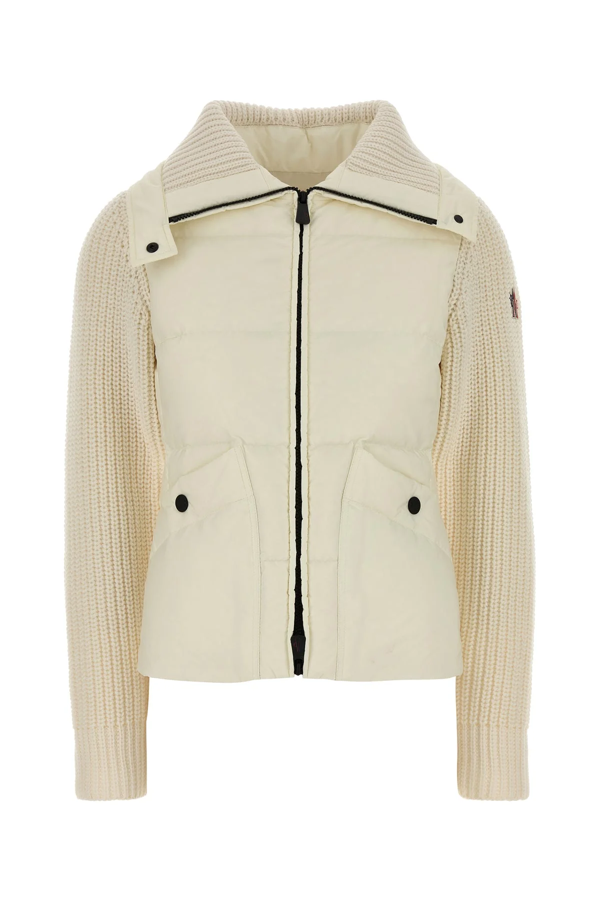 Cardigan realized in pure wool with quilted nylon insert enriched by contrasting logoed patch on the sleeve. - Maxi collar - Concealed zip closure - Two patch pockets at the front - Partially lined DETAILS Ivory wool cardigan Exterior: 100% Wool Lining: 100% Polyester Padding: 90% Down 10% Feather Made in moldova Sample size: XS