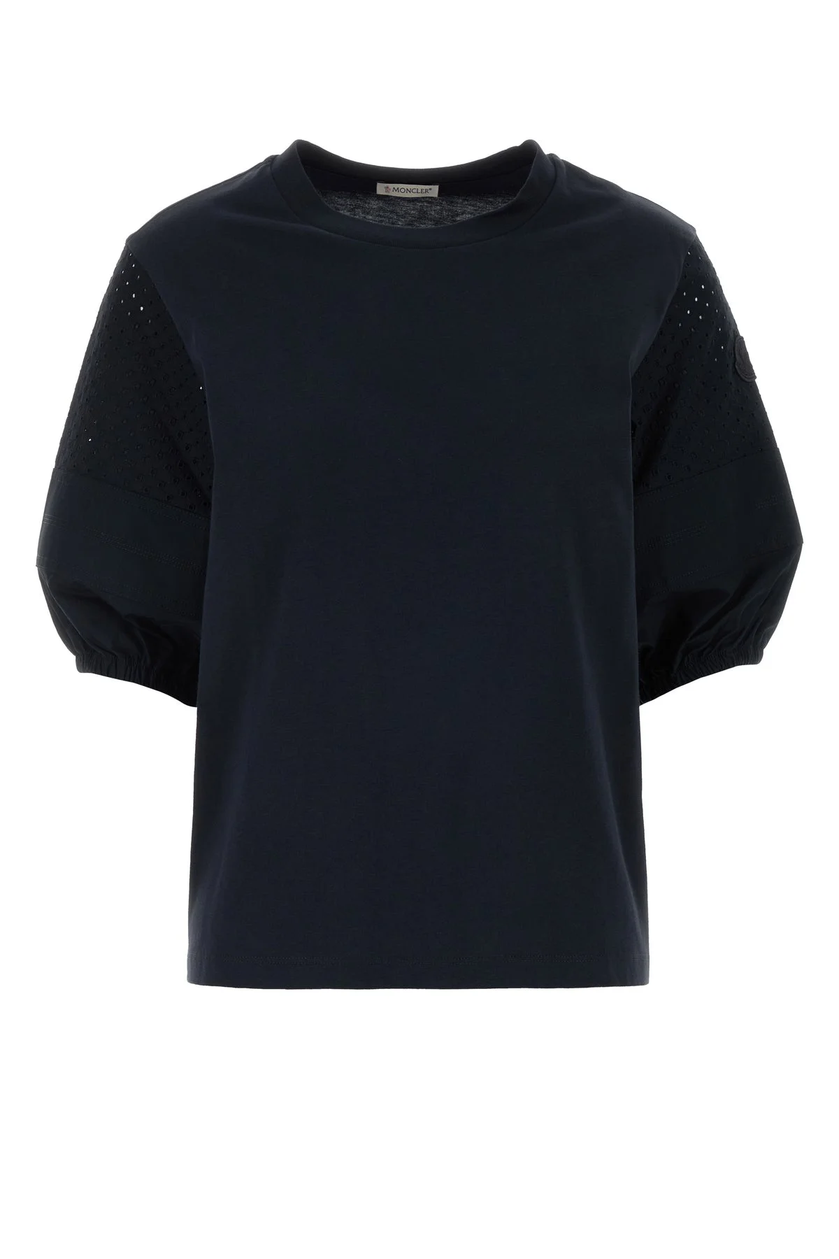 T-shirt realized in pure cotton characterized by peculiar embroidery enriched by logoed patch on the sleeves. - Ribbed crew-neck DETAILS Navy blue cotton t-shirt Exterior: 100% Cotton Made in turkiye Sample size: XS