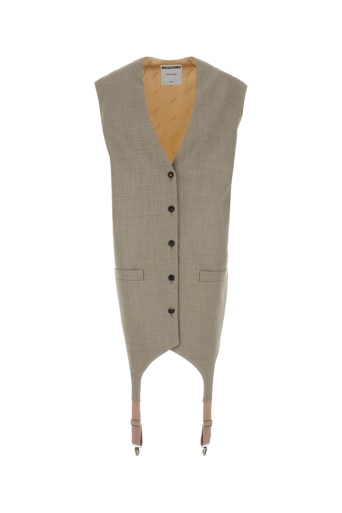 Long-cut oversize vest realized in pure virgin wool and satin characterized by Moschino embroidery at the back. - Deep V neckline - Buttons closure - Two slit pockets at the front - Half belt - Adjustable straps with hook on the hemline - Lined DETAILS Two-tone wool and satin oversize vest Exterior: 100% Virgin wool 100% Viscose Lining: 100% Viscose Made in italy Sample size: 38