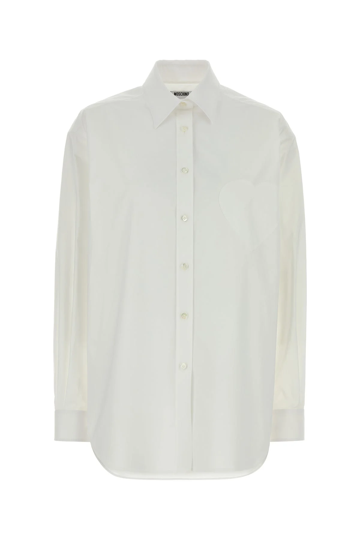 Shirt realized in stretch cotton poplin characterized by tonal Moschino embroidery at the back enriched by tonal Heart patch on the chest. - Short-pointed collar - Buttons closure - Buttoned rounded cuffs - Rear yoke DETAILS White stretch poplin shirt Exterior: 94% Cotton 6% Elastane Made in italy Sample size: S