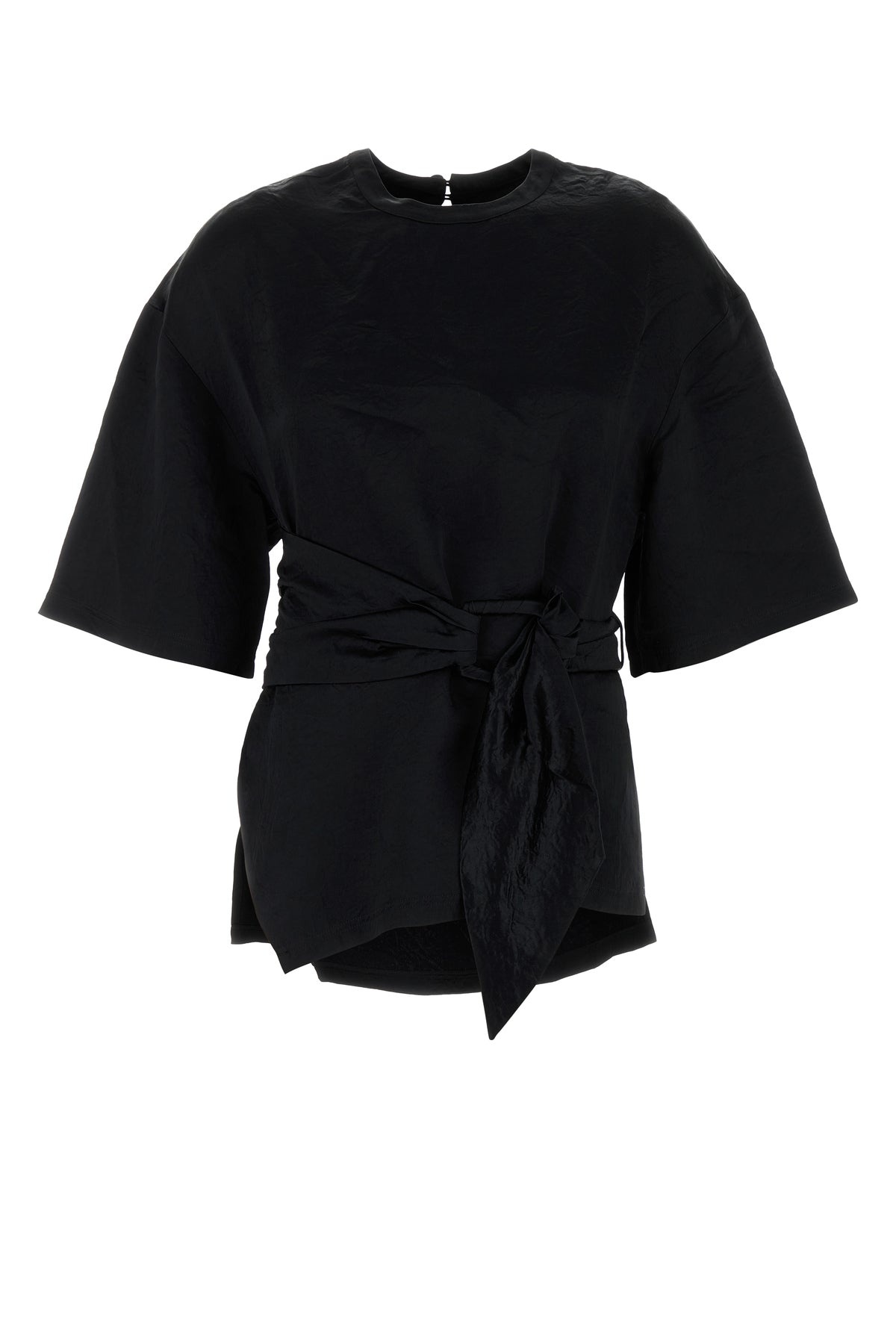 T-shirt realized in creased effect satin enriched by tonal fabric belt. - Crew-neck - Buttons closure at the back DETAILS Black satin Besia t-shirt Exterior: 100% Acetate Made in china Sample size: S