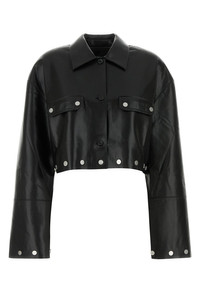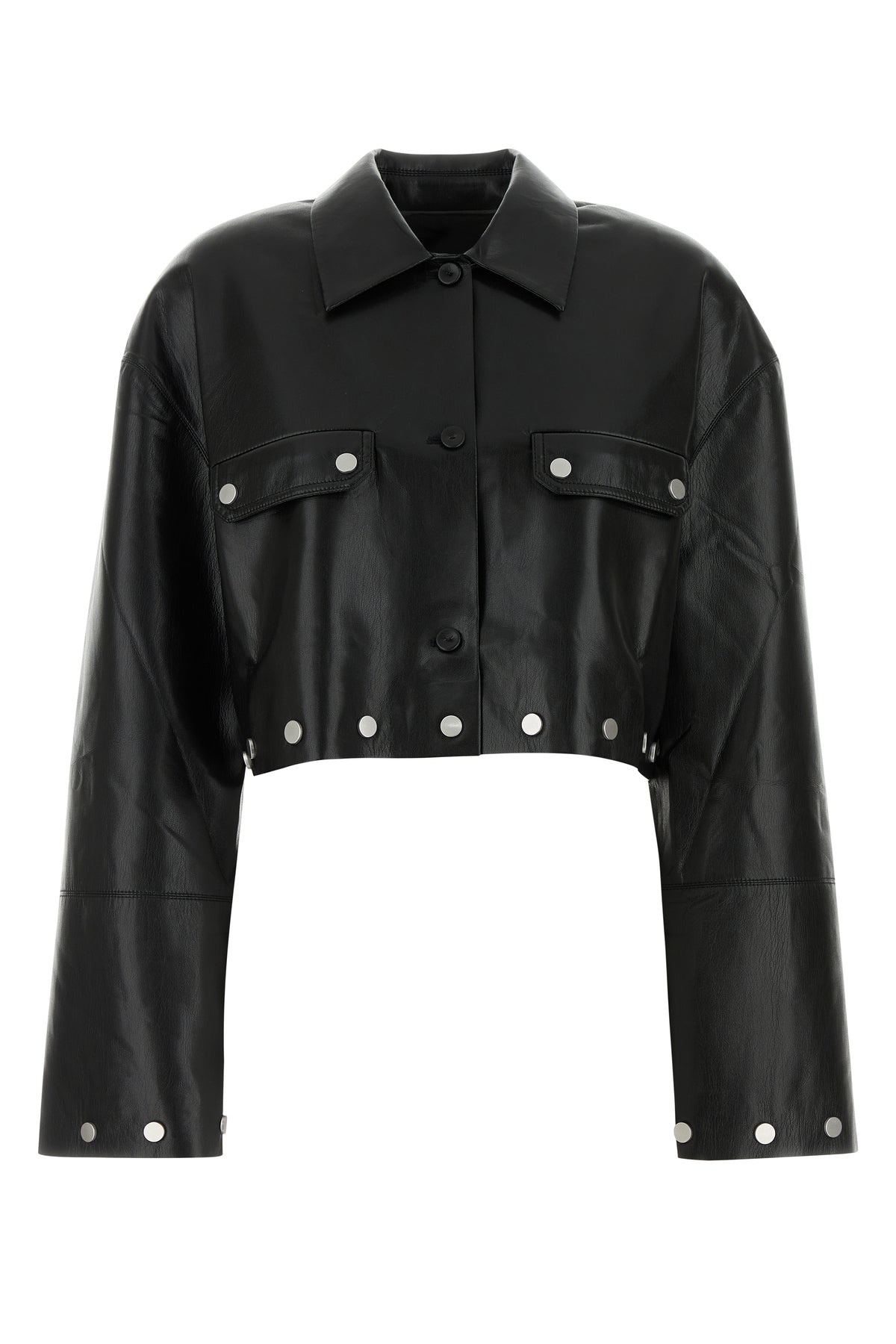 Cropped-cut shirt realized in synthetic leather enriched by metal details on the trimmings. - Pointed collar - Buttons closure - Two flap pockets at the front - Lateral slits on the hemline DETAILS Black synthetic leather Kassie shirt Exterior: 100% Polyester 100% Polyurethane Made in china Sample size: S