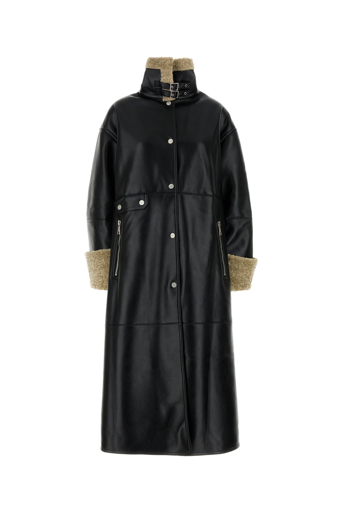 Coat realized in synthetic leather enriched by contrasting eco fut inserts. - Pointed collar with adjustable straps - Buttons closure - Two zip pockets and a flap pockets at the front - Folded cuffs - Lined DETAILS Black synthetic leather Liesel coat Exterior: 100% Polyester Lining: 100% Poliestere Made in hungary Sample size: S