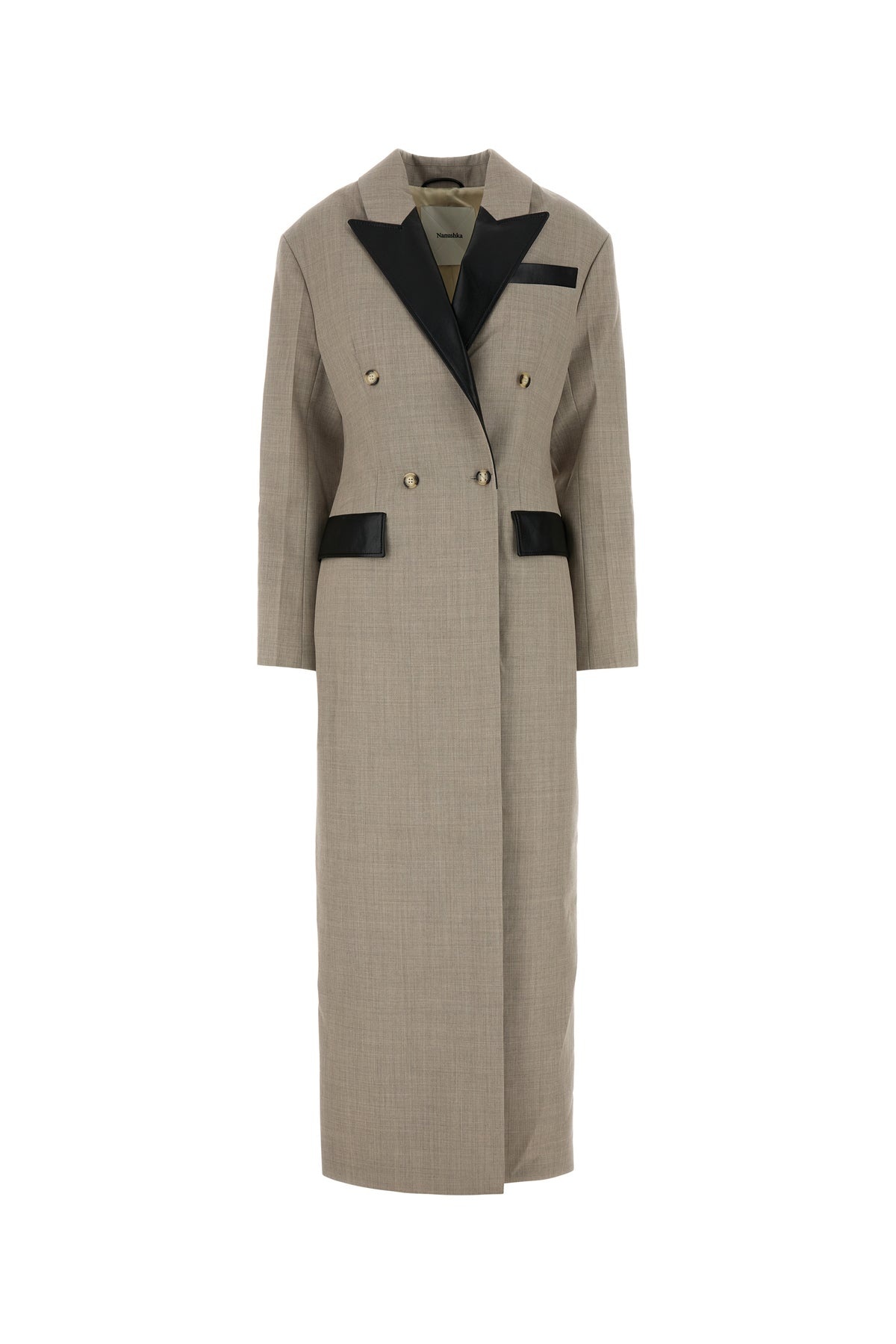Coat realized in pure wool twill with contrasting synthetic leather inserts on the peak lapels, on the chest pocket and on the two flap pockets at the front. - Buttons closure - Four buttons on the sleeves - Central slit at the back - Lined DETAILS Dove grey twill Ferris coat Exterior: 100% Wool Lining: 80% Polyester 20% Nylon Made in hungary Sample size: S
