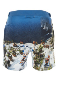 Swimming shorts realized in polyester characterized by Terrace print on the entire surface enriched by logoed label on the side. - Concealed zip and snap button closure - Adjustable straps at the waist - Slant pockets and a zip pocket at the back - Lateral slits on the hemline - Partially mesh lined DETAILS Printed polyester Bulldog Photographic swimming shorts Exterior: 100% Polyester Lining: 100% Polyester Made in portugal Sample size: 31
