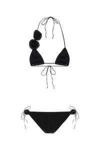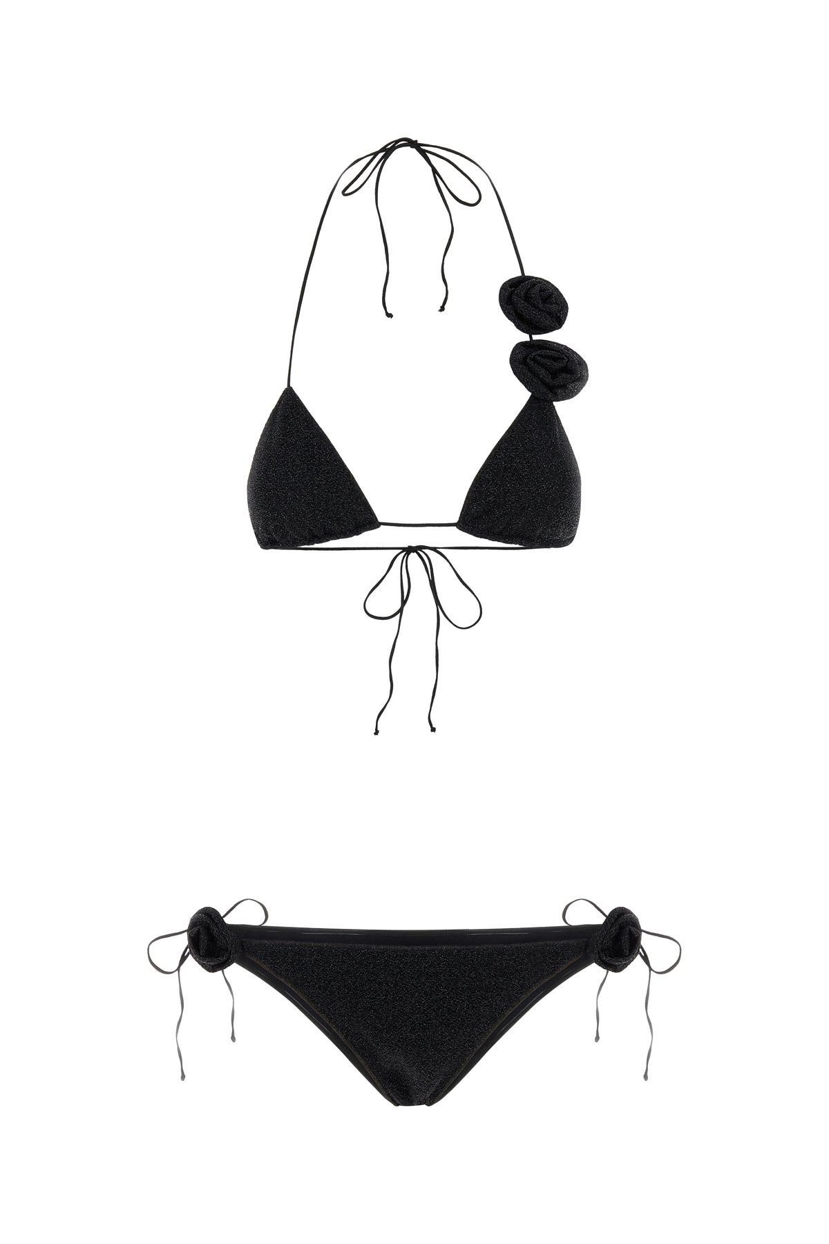 Bikini realized in nylon blend with lurex threads enriched by floral embellishments at the front. - Triangle bikini top - Laces to tie closure - Lined DETAILS Black nylon blend bikini Exterior: 64% Nylon 36% Metallic fiber Lining: 82% NYlon 18% Elastane Made in italy Sample size: S