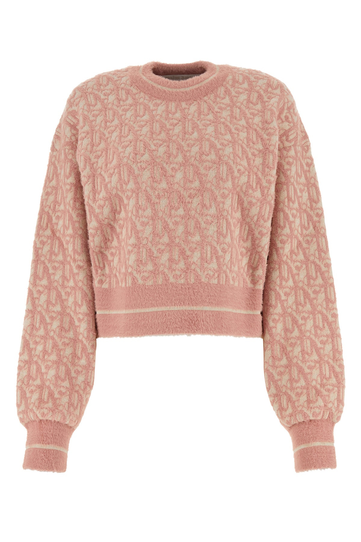 Cropped-cut sweater realized in nylon blend characterized by Monogram motif embroidery on the entire surface. - Ribbed crew-neck, cuffs and hemline - Loose fit DETAILS Exterior: 56% Nylon 44% Virgin wool Made In Italy Sample size: XS