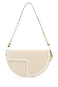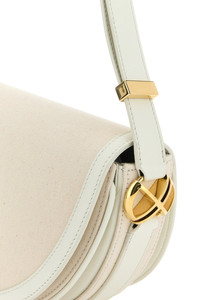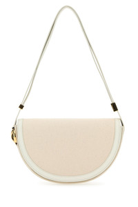 Shoulder bag realized in pure cotton canvas and smooth calf leather enriched by logoed metal detail on the side. - Adjustable leather flat handle - Concealed magnetic buttons closure - Lined interior with a slit pocket DETAILS Exterior: 100% Cotton 100% Calf Lining: 100% Fabric Finishing: Golden metal Made In Spain Width: 25 cm Height: 15 cm Depth: 6 cm Min shoulder strap length: 28 cm Max shoulder strap length: 47 cm