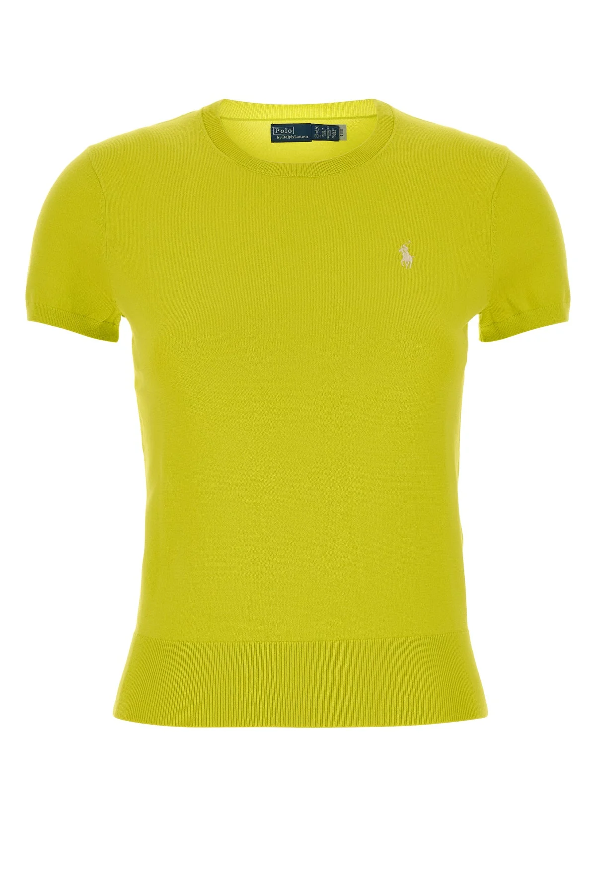 Short-sleeve sweater realized in stretch cotton blend characterized by iconic embroidered logo on the chest. - Ribbed crew-neck, cuffs and hemline DETAILS Flo yellow stretch cotton blend sweater Exterior: 80% Cotton17% Nylon 3% Elastane Made in china Sample size: XS