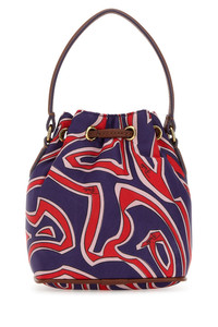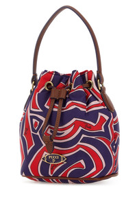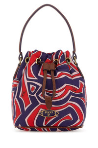 Bucket bag realized in canvas characterized by peculiar print on the entire surface enriched by logoed metal detail at the front. - A leather flat handle - Adjustable detachable leather shoulder strap - Drawstring closure - Lined interior with a patch pocket DETAILS Printed canvas bucket bag Exterior: 100% Fabric Lining: 100% Fabric Finishing: Golden metal Made in italy Width: 15 cm Height: 17 cm Depth: 10 cm Handle height: 8 cm Min shoulder strap length: 28 cm Max shoulder strap length: 60 cm