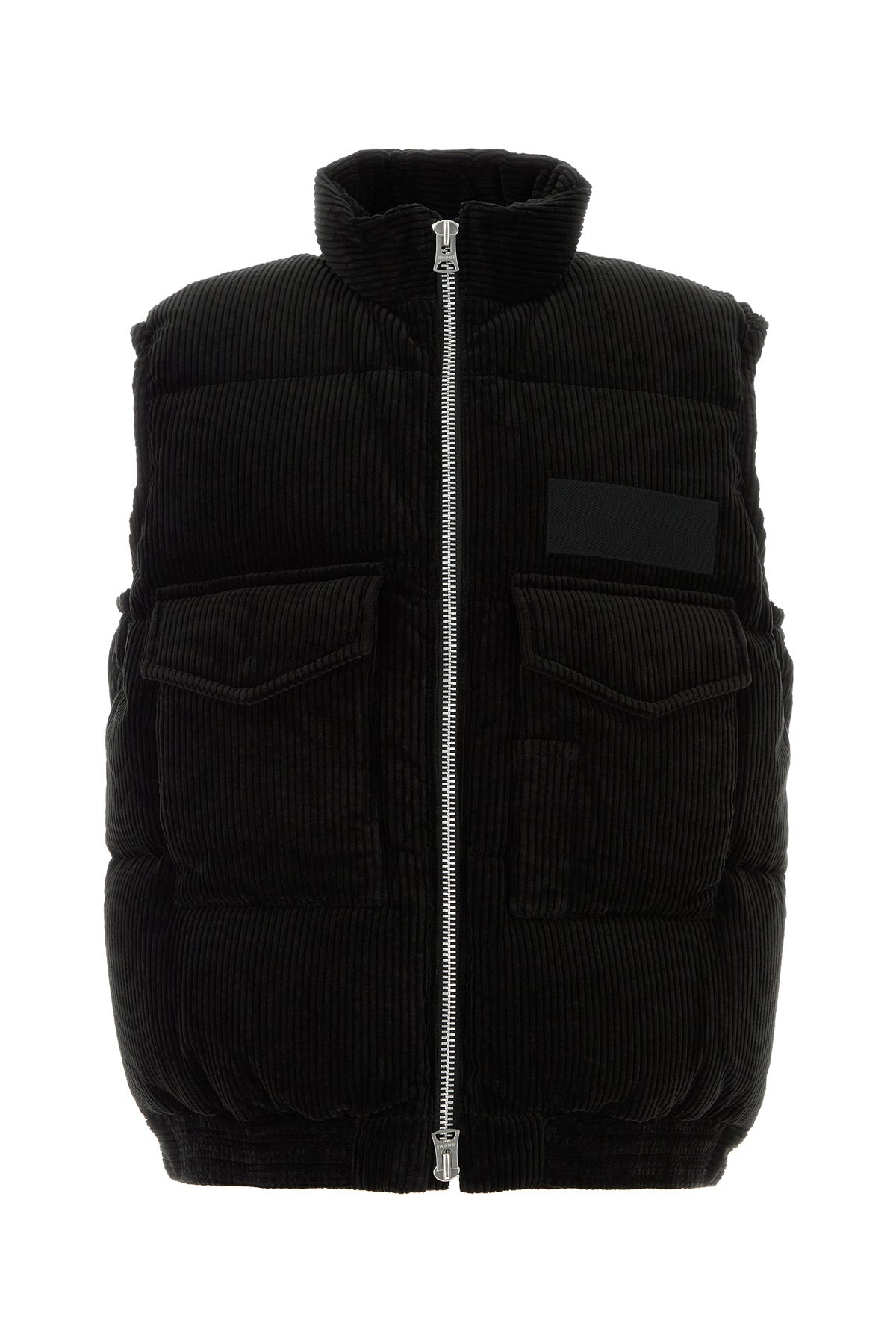 Sleeveless down jacket realized in pure cotton corduroy characterized by high collar. - Zip closure - Two flap pockets at the front - Lined interior with two slit pockets DETAILS Black corduroy down jacket Exterior: 100% Cotton Lining: 100% Nylon Padding: 90% Down 10% Feather Made in china Sample size: 1