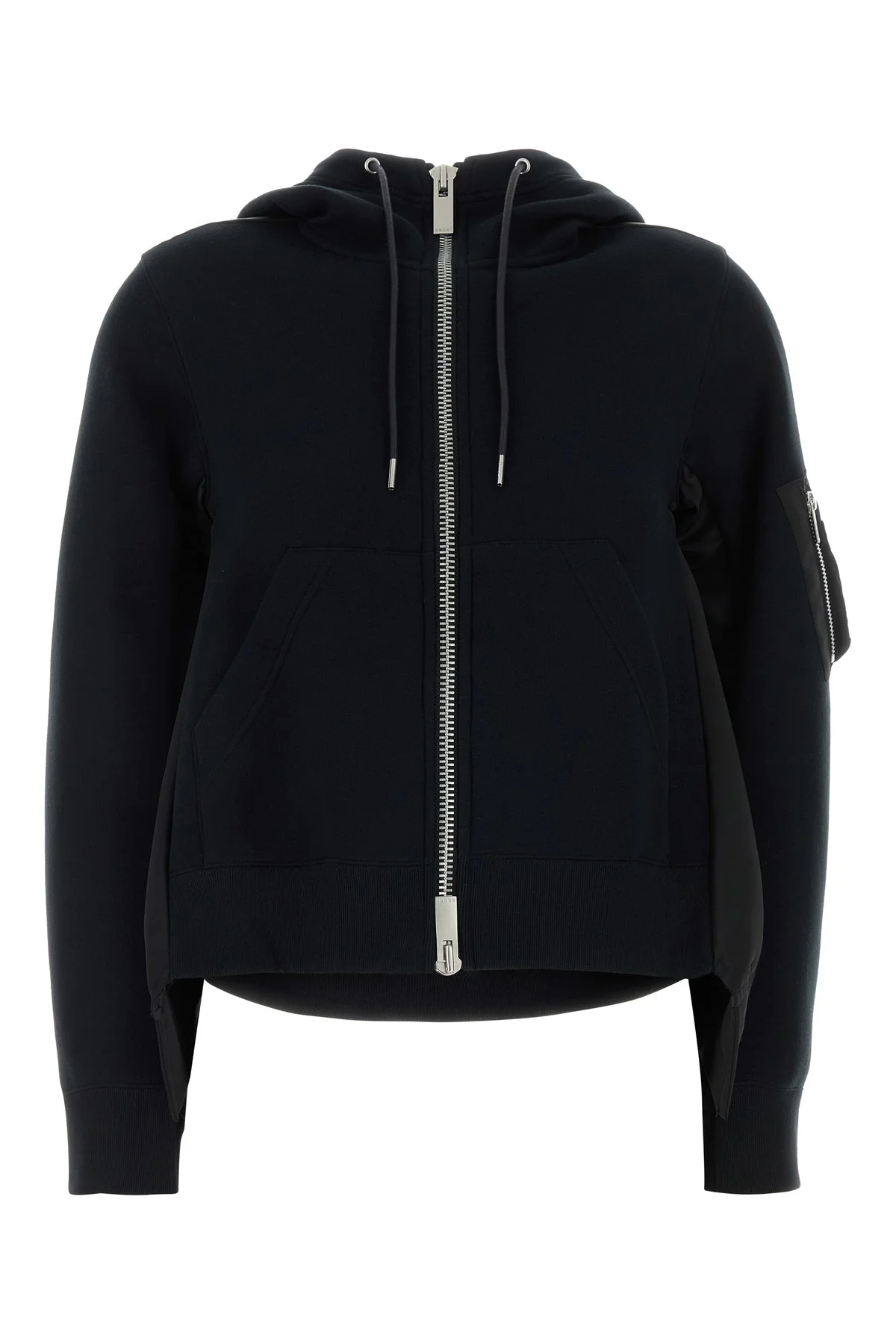 Sweatshirt realized in cotton blend and nylon. - Drawstring hood - Zip closure - Two patch pockets at the front - Ribbed cuffs and hemline - Asymmetric hemline DETAILS Black cotton blend and nylon sweatshirt Exterior 1: 62% Cotton 38% Polyester Exterior 2: 100% Nylon Made in japan Sample size: 1