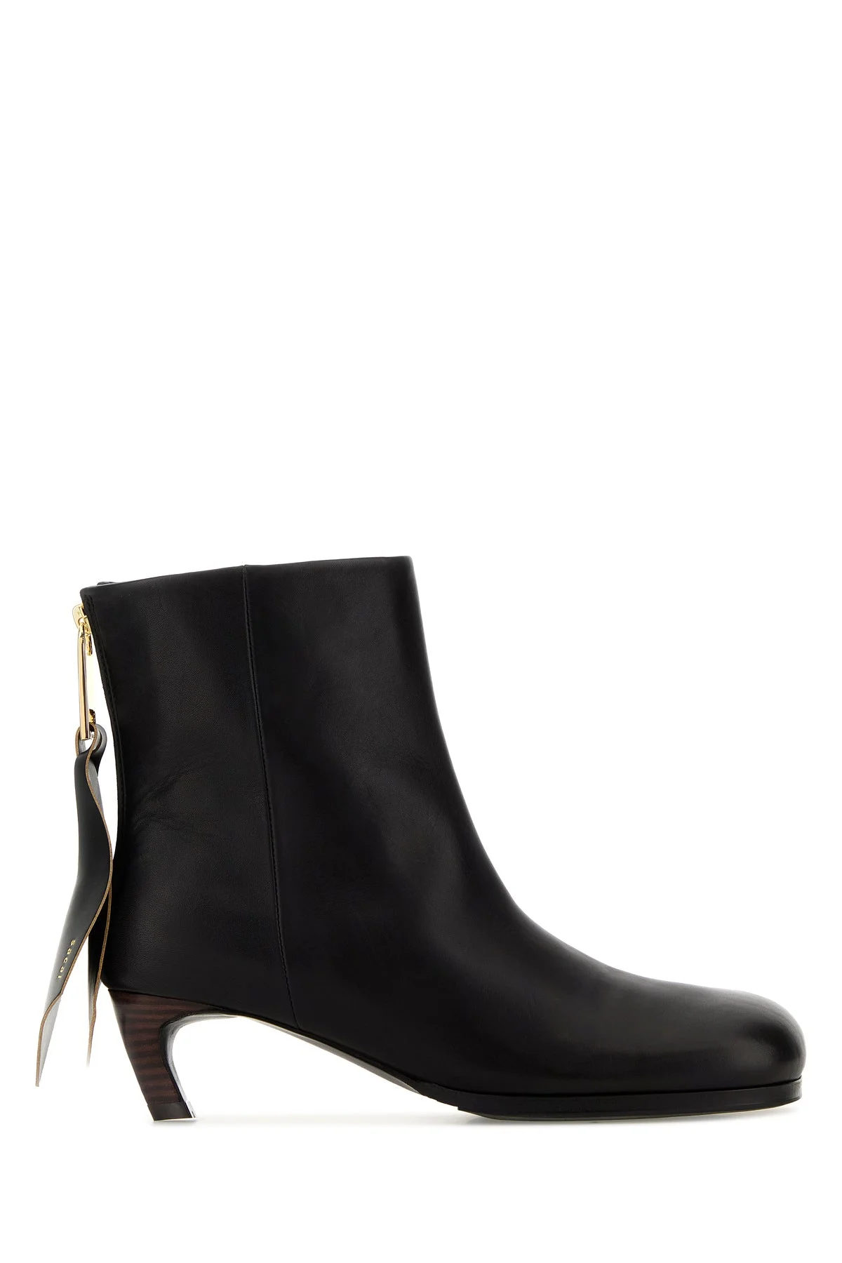 Ankle boots realized in bovine leather enriched by logoed leather patch at the back. - Round toe - Zip closure at the back - Printed logo on the inside - Peculiar heel DETAILS Black leather ankle boots Exterior: 100% Bovine leather Interior: 100% Leather Sole: Rubber Made in japan Heel height: 5 cm