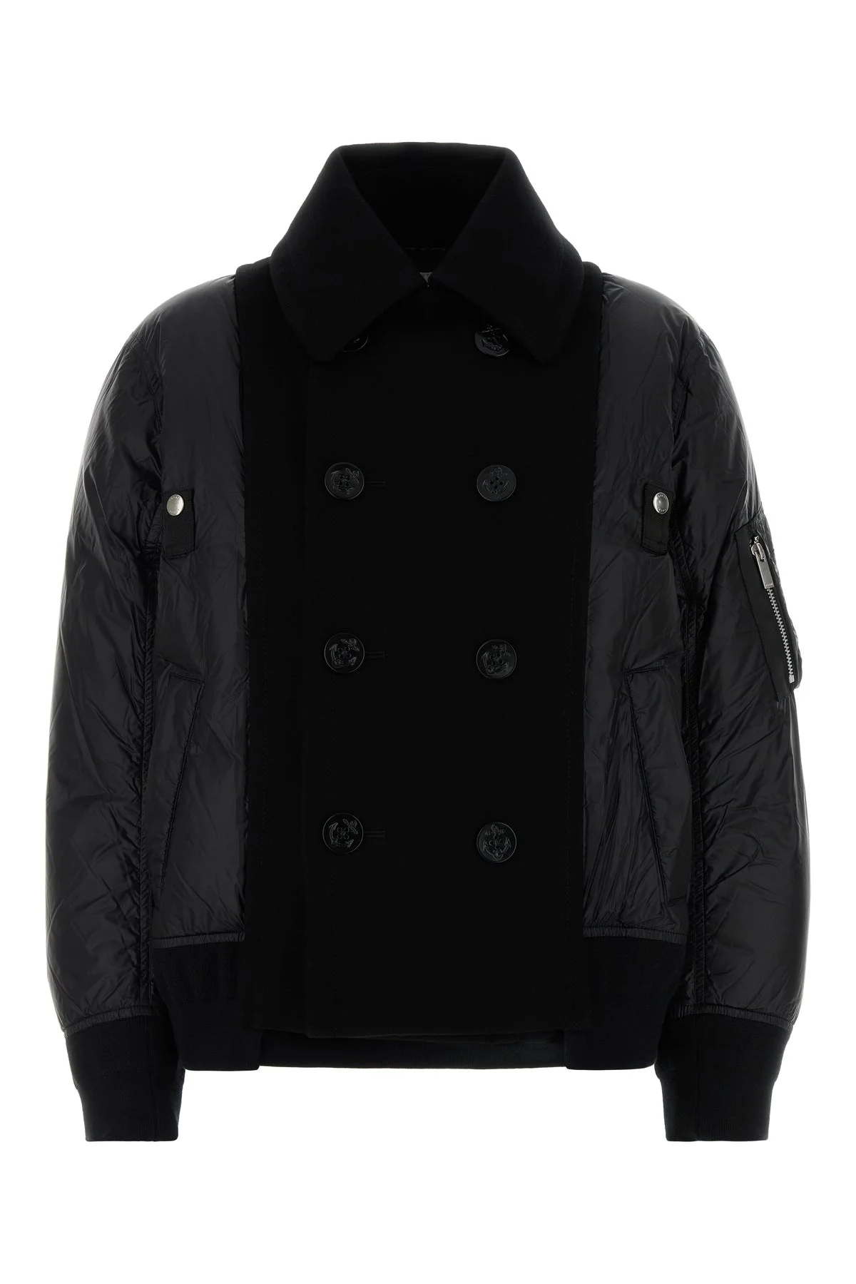 Down jacket realized in nylon with wool insert at the front characterized by collar. - Buttons closure - Two slit pockets at the front and a zip pocket on the sleeve - Ribbed cuffs and hemline - Lined DETAILS Black nylon sown jacket Exterior 1: 100% Nylon Exterior 2: 100% Wool Lining: 100% Nylon Padding: 90% Down 10% Feather Made in china Sample size: 1