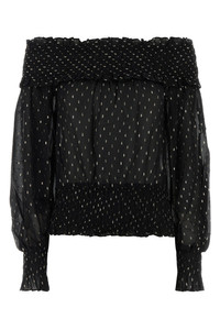 Top realized in chiffon with lurex threads enriched by ruffles. - Squared neckline - Off-the-shoulder - Puff sleeves DETAILS Two-tone chiffon top Exterior: 99% Viscose 1% Metallic fiber Made in china Sample size: 6