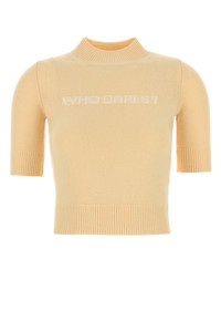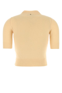 Short-sleeves sweater realized in wool and cashmere characterized by peculiar contrasting embroidery on the chest. - Ribbed crew-neck, cuffs and hemline DETAILS Yellow wool blend Renon sweater Exterior: 80% Wool 20% Cashmere Made in Sample size: XS