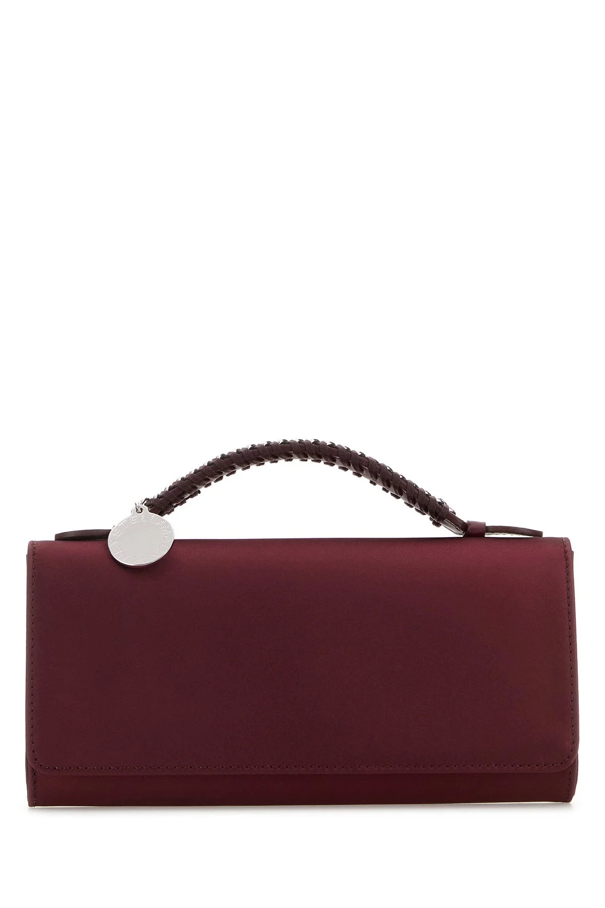 Handbag realized in satin enriched by logoed metal detail at the top. - A fabric and metal flat handle - Detachable metal chain shoulder strap - Magnetic button closure under the flap - Lined interior with a patch pocket DETAILS Burgundy satin Falabella handbag Exterior: 100% Polyester Lining: 100% Fabric Finishing: Silver metal Made in Width: 23 cm Height: 11 cm Depth: 4 cm Handle height: 4 cm Shoulder strap length: 52 cm