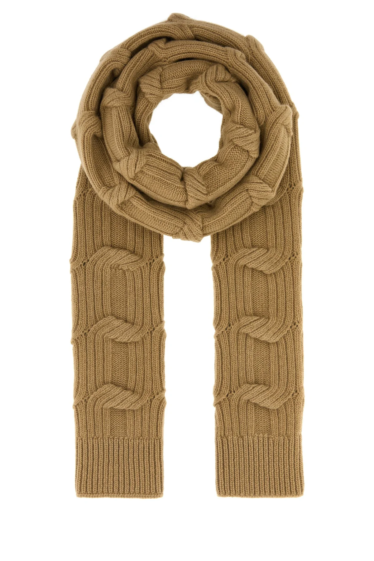 Knitted scarf realized in pure wool. - Logoed label on the hemline - Ribbed edges DETAILS Camel wool scarf Exterior: 100% Wool Made in italy Width: 210 cm Height: 20 cm