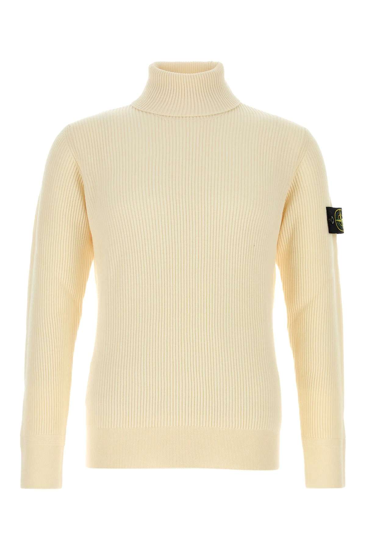 Sweater realized in pure ribbed virgin wool enriched by detachable logoed label on the sleeve. - Turtleneck DETAILS Ivory wool sweater Exterior: 100% Virgin wool Made in tunisia Sample size: M