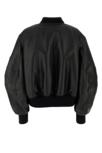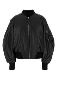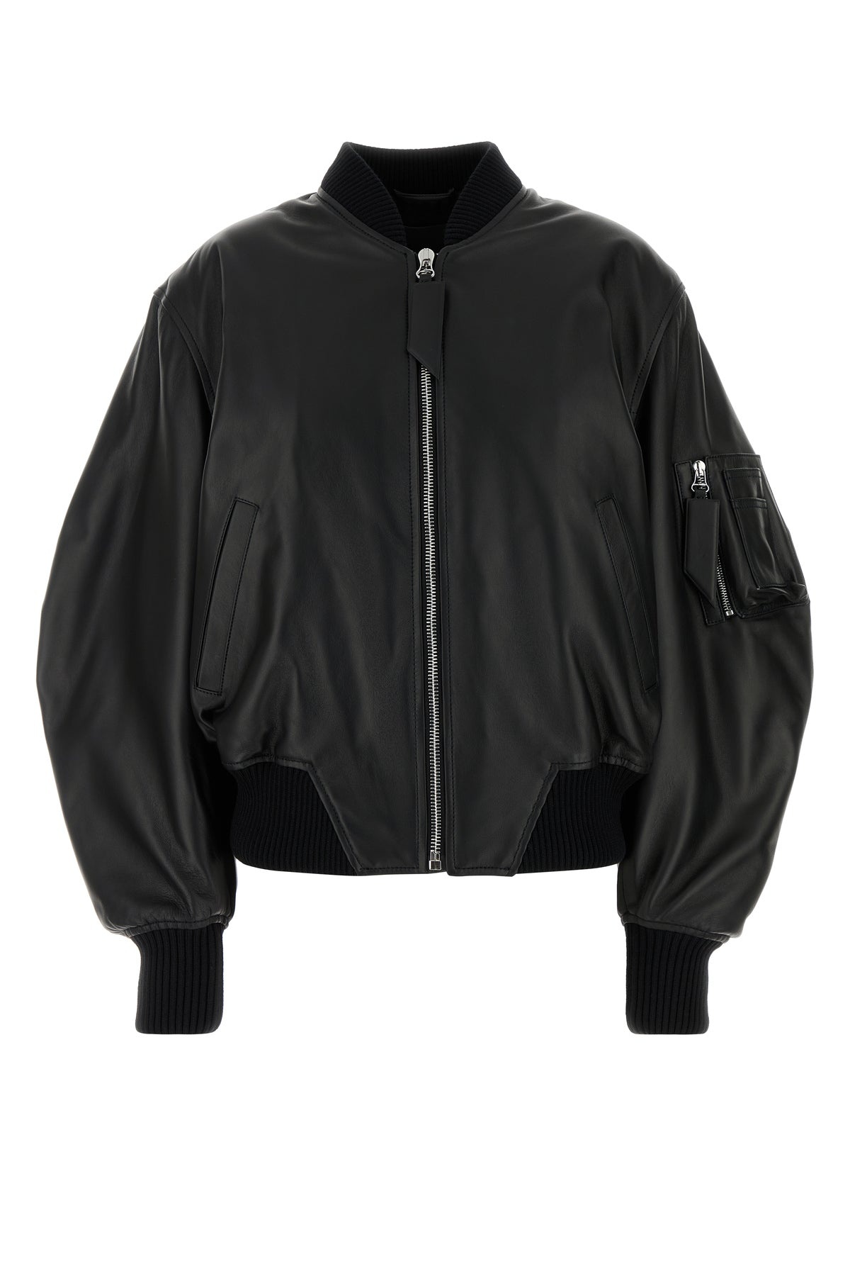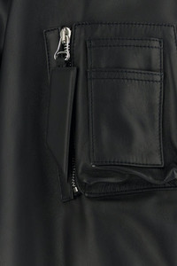 Bomber jacket realized in slightly pebble lamb leather characterized by ribbed crew-neck, cuffs and hemline. - Zip closure - Two slit pockets at the front, two patch pockets and a zip pocket on the sleeve - Lined DETAILS Black leather bomber jacket Exterior: 100% Lamb Lining: 100% Viscose Made in romania Sample size: 38