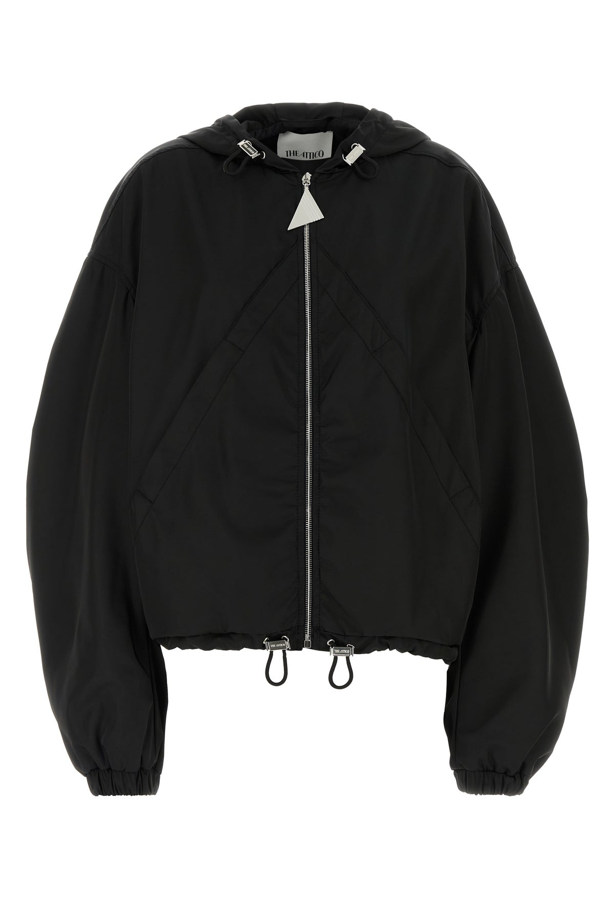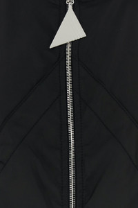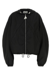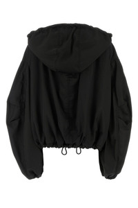 Bomber jacket realized in polyester characterized by drawstring maxi hood. - Zip closure - Two zip pockets at the front - Elastic cuffs - Drawstring on the hemline - Lined DETAILS Black polyester bomber jacket Exterior: 100% Polyester Lining: 100% Viscose Made in italy Sample size: 38