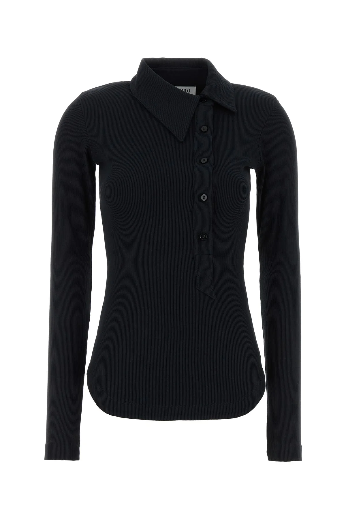 Long-sleeves polo shirt realized in ribbed stretch cotton characterized by tonal embroidered logo at the back. - Collar - Partial buttons closure - Rounded hemline DETAILS Black stretch cotton polo shirt Exterior: 98% Cotton 2% Elastane Made in portugal Sample size: 38