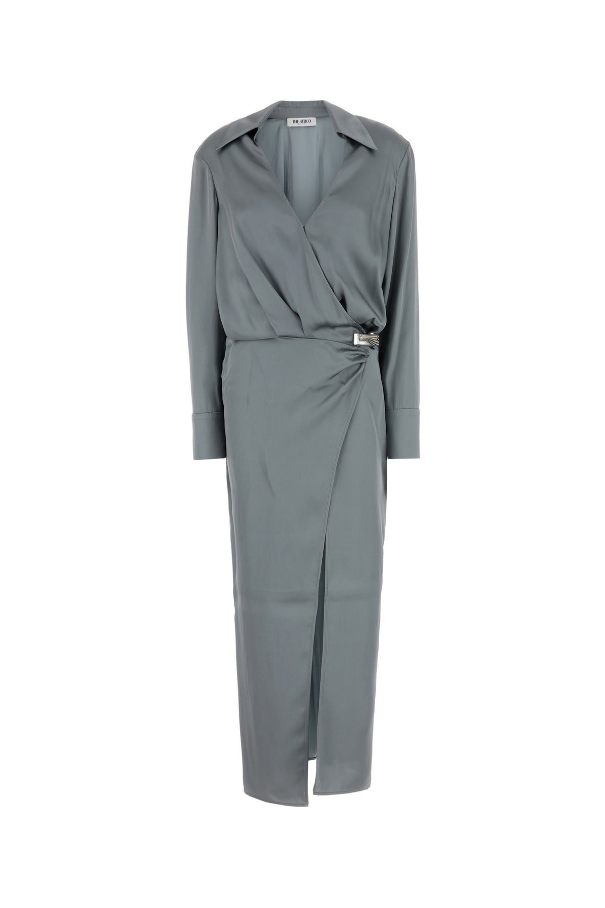 Dress realized in satin enriched by logoed metal detail at the waist. - V neckline - Wrap closure by button - Angle cuffs with buttons - Unlined DETAILS Dark grey satin dress Exterior: 100% Viiscose Made in italy Sample size: 40
