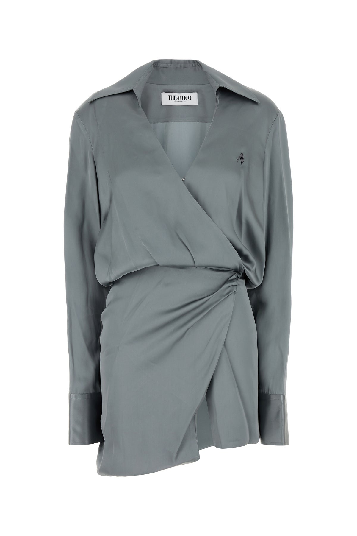 Mini dress realized in satin characterized by tonal embroidered logo on the chest. - Collar - V neckline - Wrap closure by concealed hook and button - Buttoned cuffs - Asymmetric hemline - Unlined DETAILS Grey satin mini dress Exterior: 100% Viscose Made in italy Model is 170 cm and is wearing a size 38