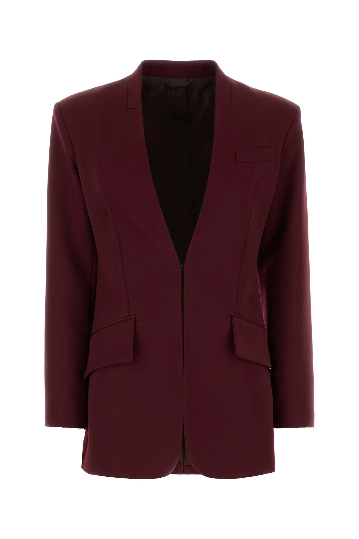 Blazer realized in pure virgin wool gabardine enriched by logoed meal plate on the side. - V neckline - Padded shoulders - Hook closure - A chest pocket and two flap pockets at the front - Four buttons on the sleeves - Central slit at the back - Lined DETAILS Plum gabardine blazer Exterior: 100% Virgin wool Lining: 100% Viscose Made in italy Sample size: 38