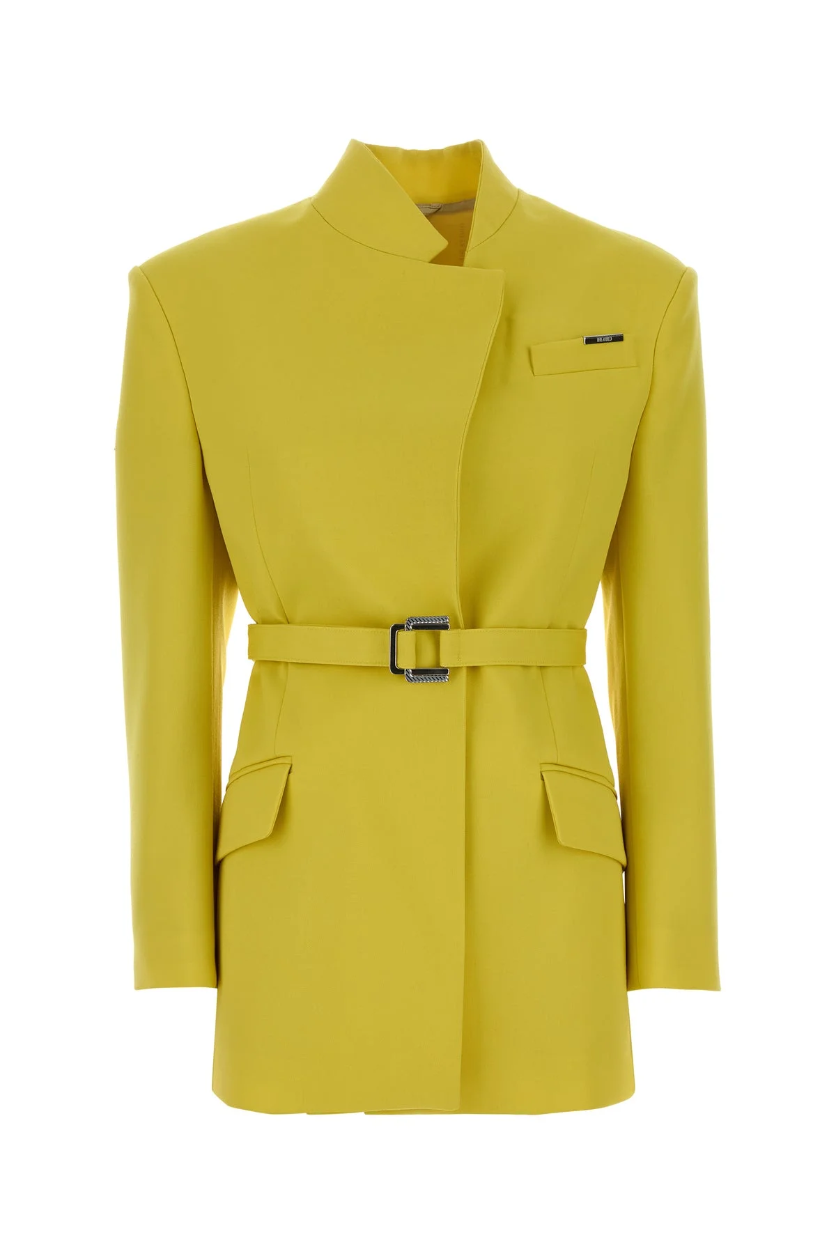 Blazer realized in pure viri wool gabardine enriched by metal logoed plate on the chest. - Asymmetric collar - Padded shoulder - Single-breasted closure by concealed button - Chest pocket and two flap pockets on the sides - Detachable belt with metal logoed buckle - Buttoned cuffs - Central slit at the back - Lined DETAILS Yellow gabardine blazer Exterior: 100% Virgin wool Lining: 100% Viscose Made in italy Sample size: 38