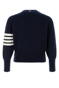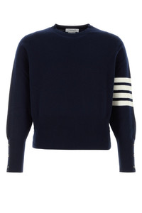 Sweater realized in pure cashmere characterized by striped embroidery on the sleeve enriched by iconic tricolor label at the back. - Ribbed crew-neck, cuffs and hemline - Lateral buttoned slits DETAILS Navy blue cashmere sweater Exteiror: 100% Cashmere Made in scotland Sample size: 3