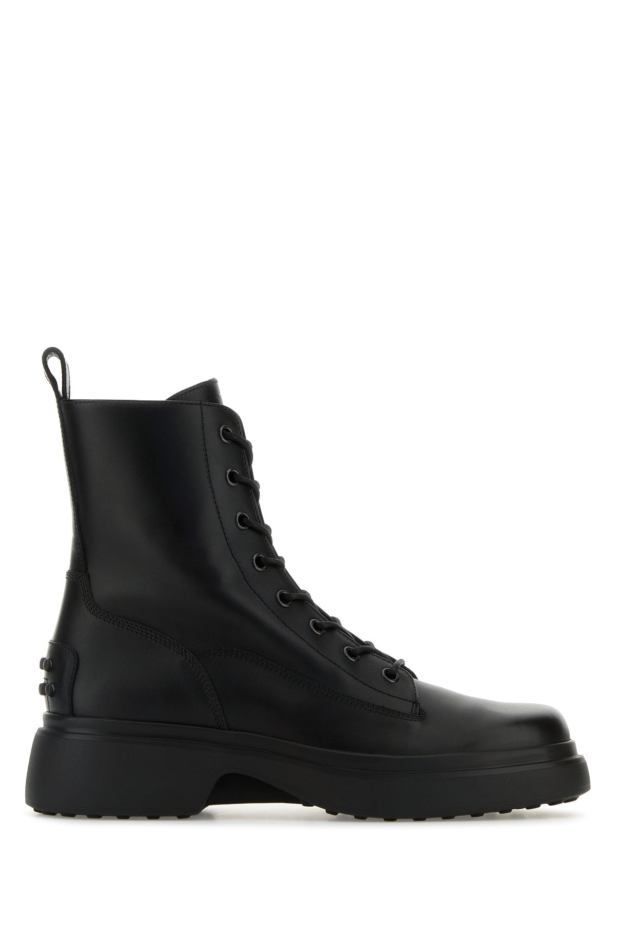 Ankle boots realized in sooth leather characterized by embossed logo on the tongue. - Lace-up closure - Round toe - Heel pull-tab - Printed logo on the inside DETAILS Black leather ankle boots Exterior: 100% Leather Interior: 100% Leather Sole: Rubber Made in italy