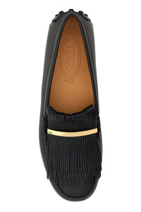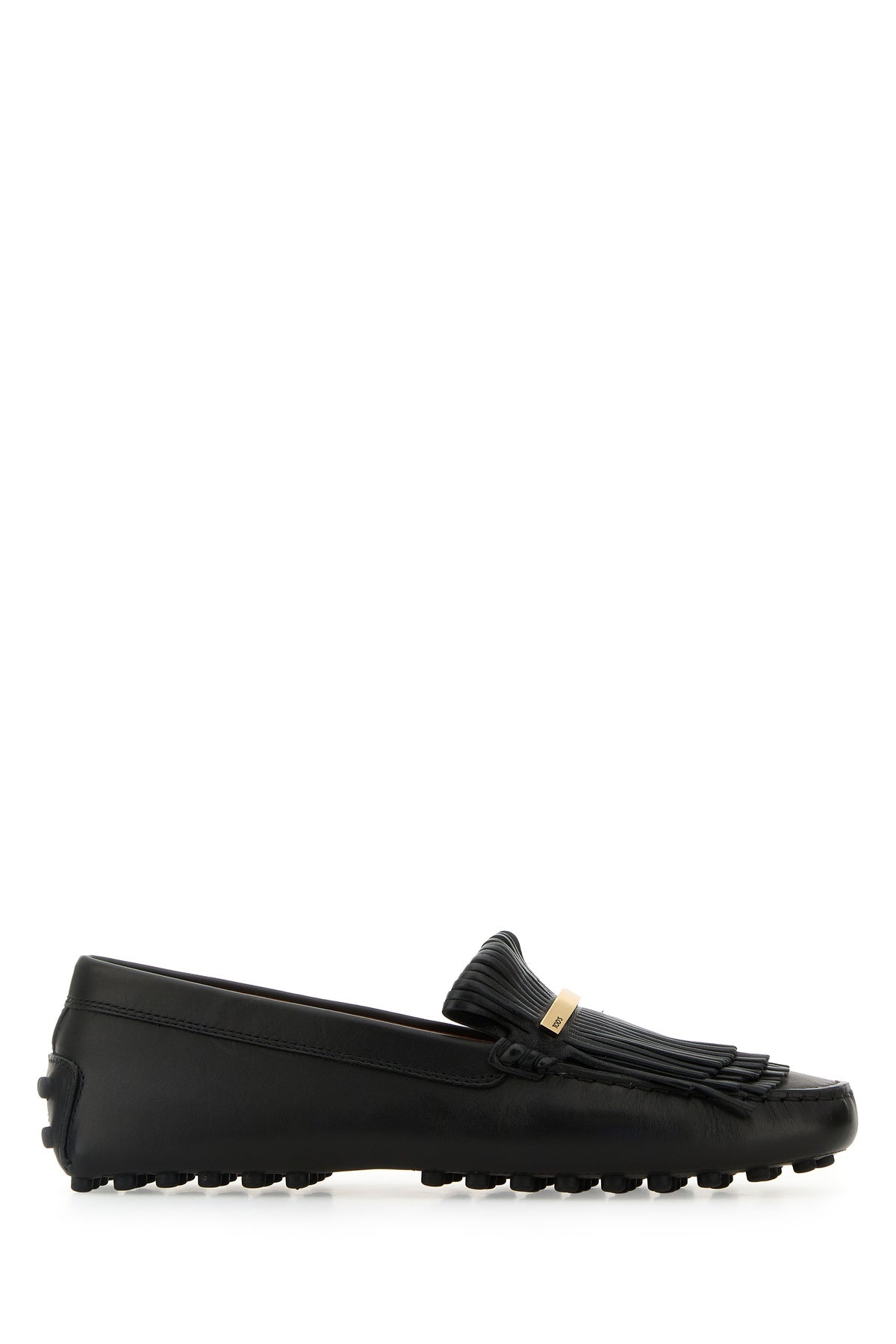 Loafers realized in smooth leather enriched by fringes and logoed metal plate on the instep. - Round toe - Embossed logo on the inside - Pebble sole DETAILS Black leather loafers Exterior: 100% Leather Interior: 100% Leather Sole: Leather and Rubber Made in italy