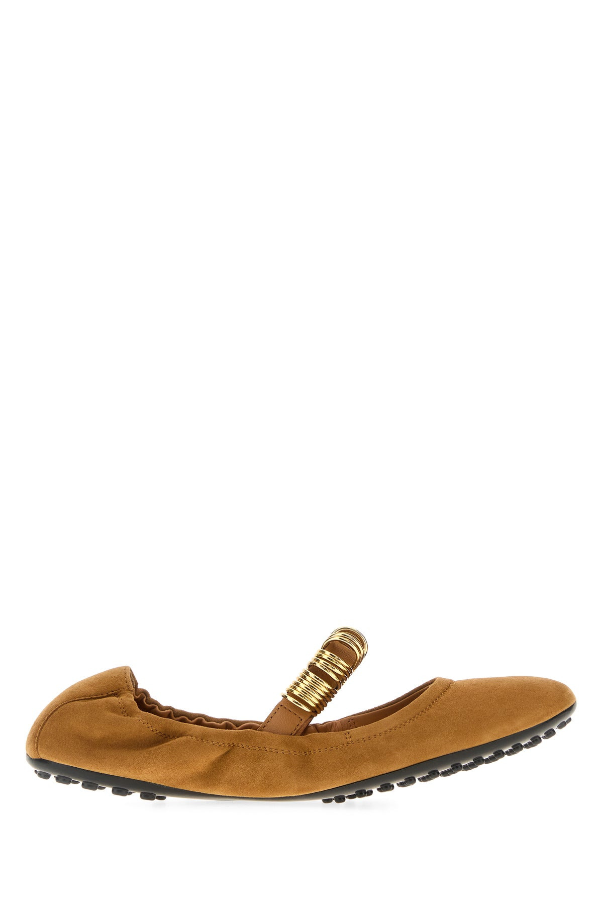 Ballerinas realized in suede enriched by embellishment with metal rings on the instep. - Round toe - Embossed logo on the inside - Pebble sole DETAILS Camel suede ballerinas Exterior: 100% Suede Interior: 100% Leather Sole: Rubber Made in italy