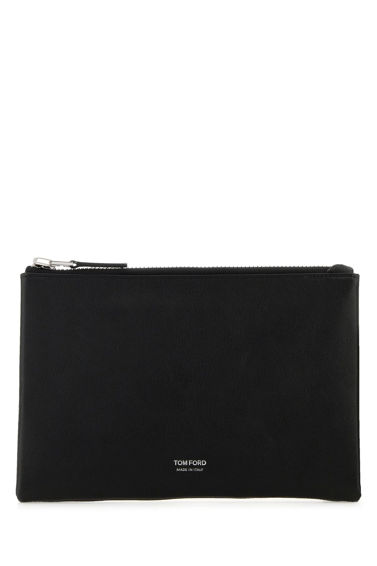 Clutch realized in pebble leather characterized by laminated printed logo at the front. - Detachable leather wrist handle - Zip closure - Lined interior with a slit pocket DETAILS Black leather clutch Exterior: 100% Leather Lining: 100% Suede Finishing: Silver metal Made in italy Width: 26 cm Height: 17 cm Depth: 3 cm
