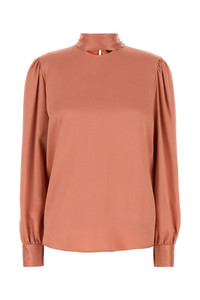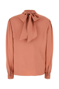 Blouse realized in pure silk satin characterized by laces to tie on the neck. - Drop-shaped opening with button at the back - Angle cuffs with buttons DETAILS Salmon satin blouse Exterior: 100% Silk Made in italy Sample size: 40