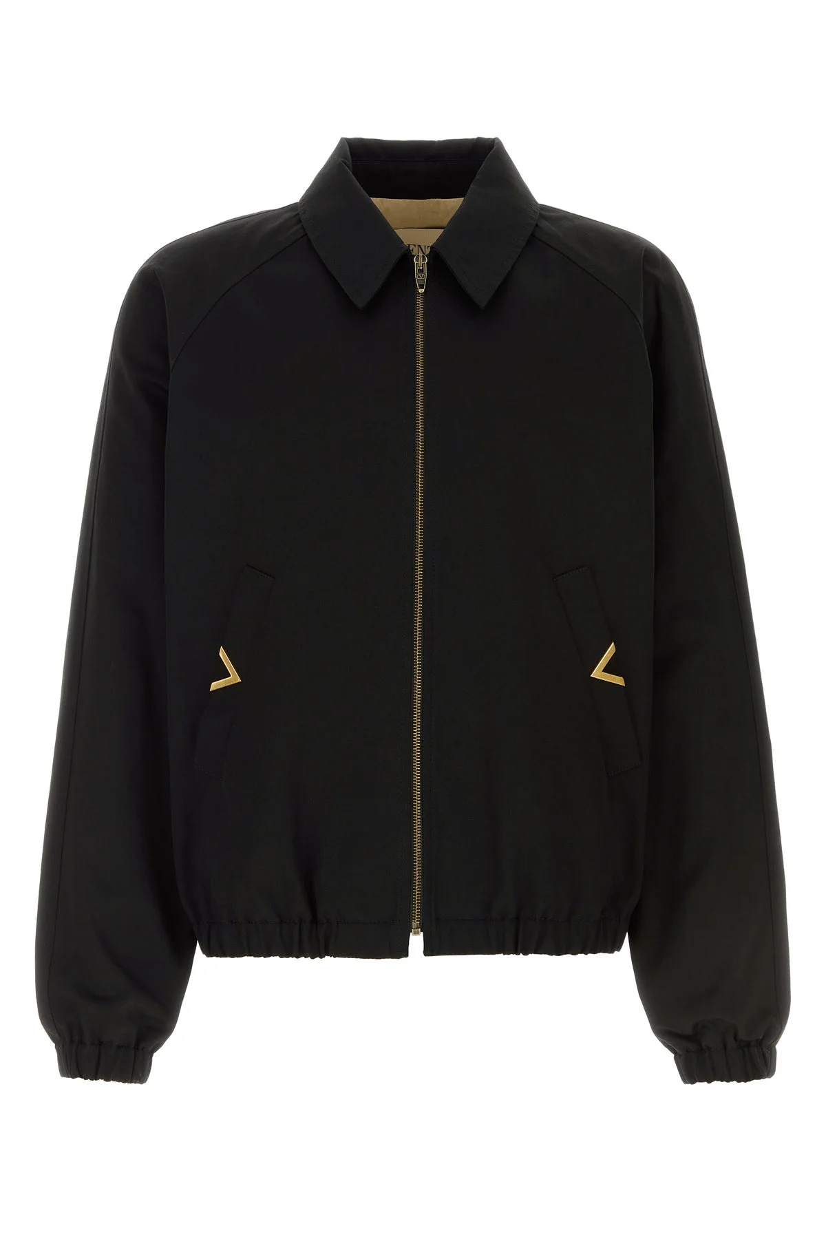 Jacket realized in pure cotton enriched by metal V Gold details at the front. - Collar - Zip closure - Two slit pockets at the front - Gathered elastic cuffs and hemline - Lined DETAILS Black cotton jacket Exterior: 100% Cotton Made in italy Sample size: 48