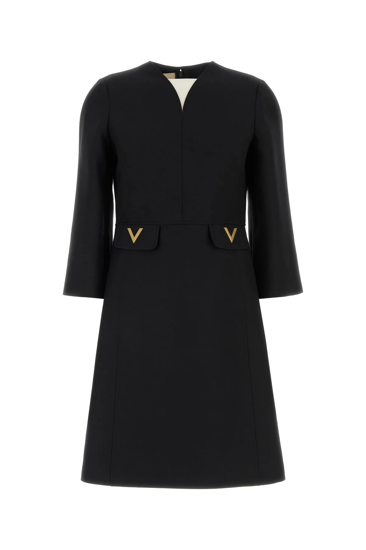Midi-length dress realized in virgin wool and silk crepe couture enriched by metal V Gold details at the front. - Crew-neck - Long sleeves - Concealed zip closure at the back - Two flap pockets at the front - Lined DETAILS Black crepe couture dress Exterior: 65% Virgin wool 35% Silk Lining: 100% Silk Made in italy Sample size: 42