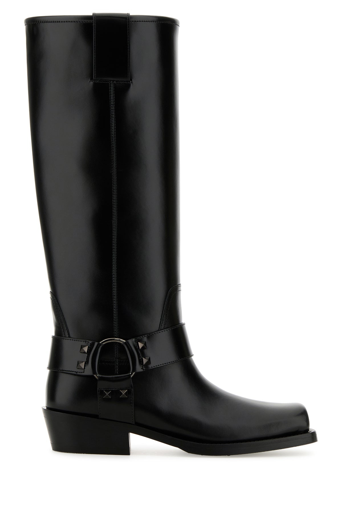 Boots realized in smooth leather enriched by decorative strap with metal buckles on the hemline. - Squared toe - Printed logo on the inside DETAILS Black leather Biker Rockstud boots Exterior: 100% Leather Interior: 100% Leather Sole: Leather and Rubber Made in italy