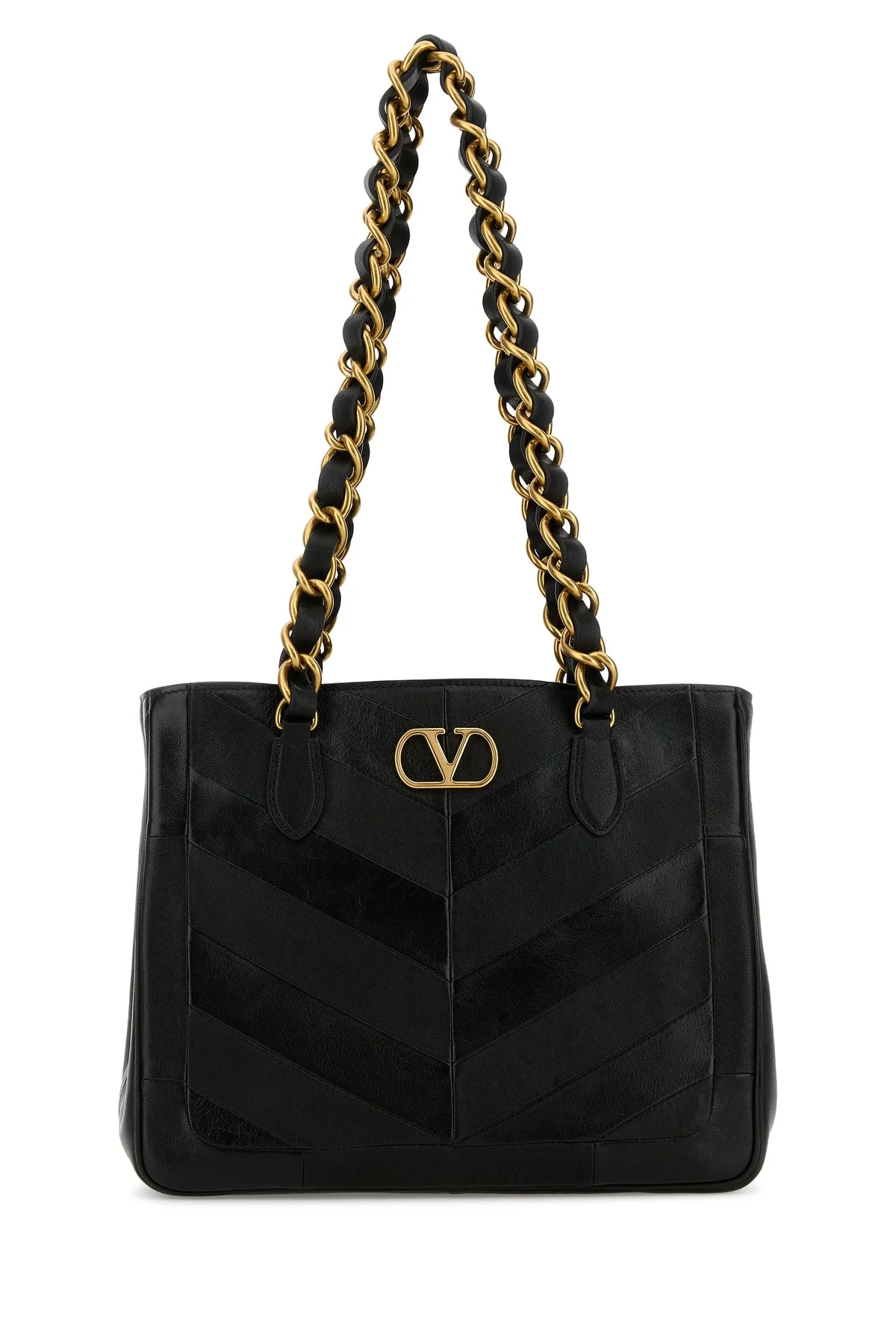 Shopping bag realized in leather enriched by VLogo Signature metal detail at the front. - Two leather and metal chain handles - Magnetic button closure - Side compression san buttons for width adjustment - Lined interior with a zip pocket DETAILS Black leather La Seine shopping bag Exterior: 100% Leather Lining: 100% Leather Finishing: Antiqued golden metal Made in italy Width: 27 cm Height: 22 cm Depth: 10 cm Handle height: 25 cm