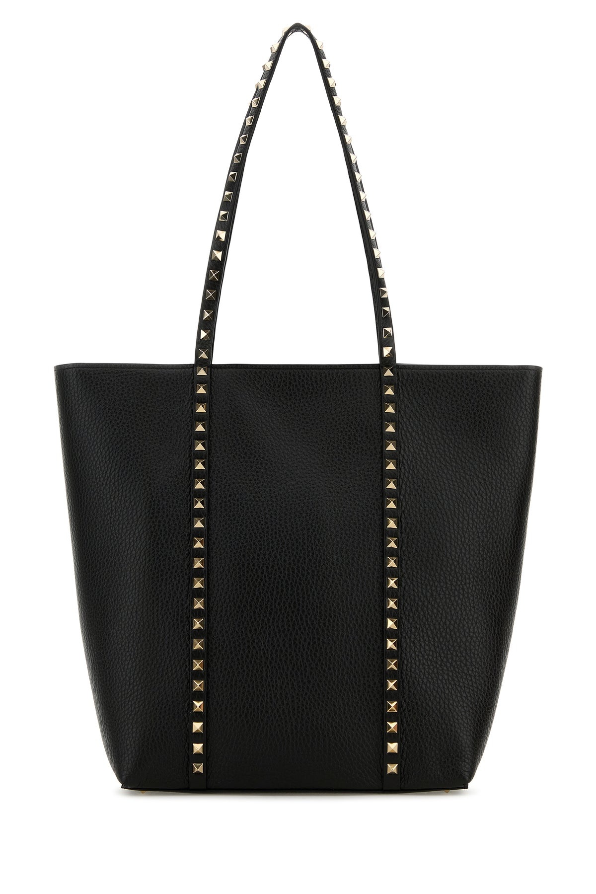 Shopping bag realized in pebble calf leather enriched by studs at the front, on the handles and at the back. - Two flat tonal leather handles - Zip closure - Split leather interior with detachable tonal leather pouch - Protective metal feet at the base DETAILS Black leather Rockstud shopping bag Exterior: 100% Calf Finishing: Platinum Made in italy Width: 25 cm Height: 31,5 cm Depth: 12,5 cm Handle height: 25 cm