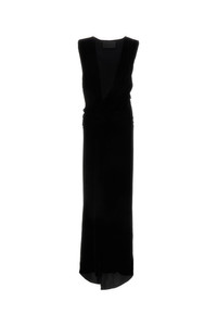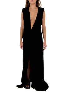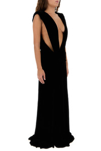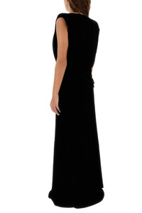 Log dress realized in velvet characterized by gathering at the front and at the back. - Deep V neckline - Concealed zip and hook closure on the side - Padded shoulders - Lateral slits at the front - Unlined DETAILS Black velvet long dress Exteiror: 78% Viscose 22% Silk Made in italy Model is 170 cm and is wearing a size 40