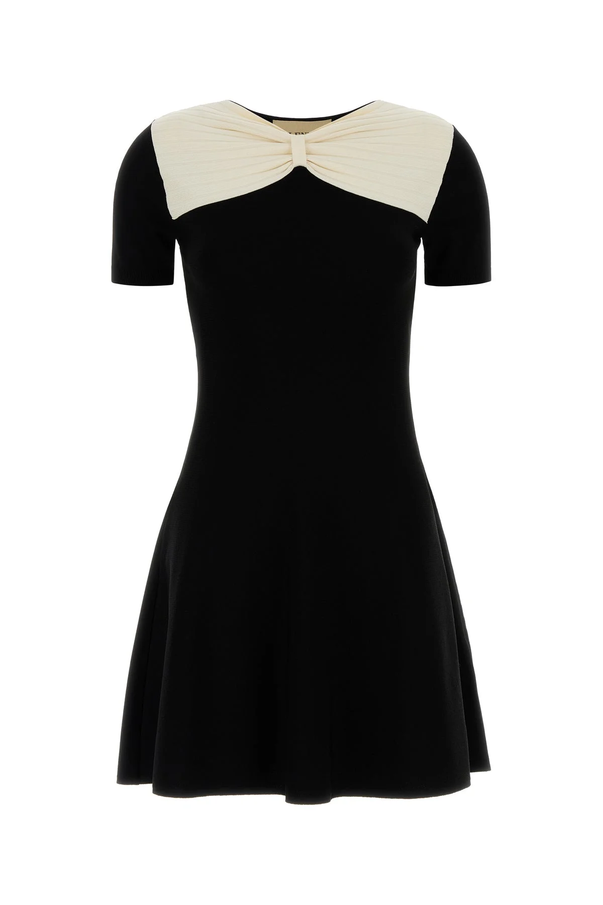 Mini dress realized in viscose blend enriched by contrasting decorative bow at the front. - V neckline - Short sleeves - Flared skirt - Unlined DETAILS Black viscose blend mini dress Exterior: 83% Viscose 17% Polyester Made in italy Sample size: S
