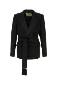 Blazer realized in pure virgin wool enriched by detachable belt with tassels to tie at the waist. - Peak lapels - Slightly padded shoulders - Single breasted closure by buttons - Chest pocket and two flap pockets at the front - Buttoned cuffs - Central slit at the back - Lined interior with two slit pockets DETAILS Black wool blazer Exterior: 100% Virgin wool Lining: 100% Viscose Made in italy Sample size: 50